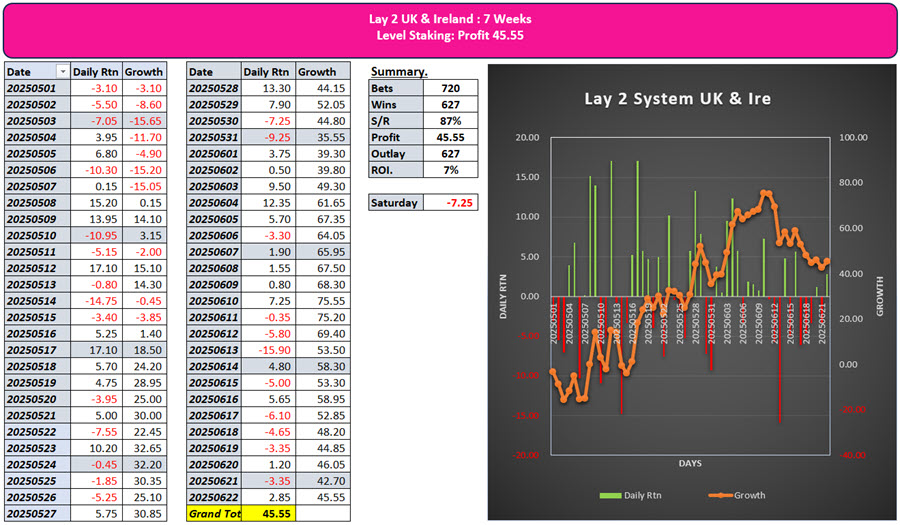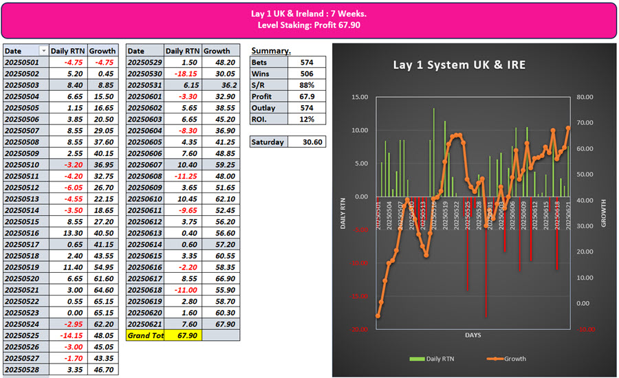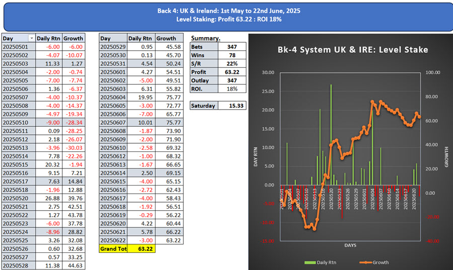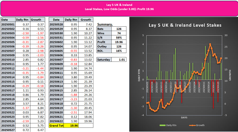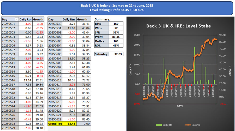 Saturday Back: Profit £47.36 (£1.00 level stake.)